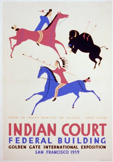 Siegriest, Louis B., Artist. Indian court, Federal Building, Golden Gate International Exposition, San Francisco, From an Indian painting on elkskin, Great Plains / / Siegriest. San Francisco, California, 1939. [California: Federal Art Project, WPA] Photograph. https://www.loc.gov/item/98518793/.